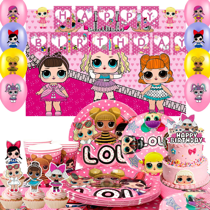 LOL Party Supplies Set: This surprise doll birthday party supplies set includes 1 surprise doll cake topper, 1 surprise doll banner, 10 7" surprise doll birthday plates, 10 9" surprise doll cake plates, 10 surprise doll paper cups, 12 surprise doll balloons, 12 surprise doll cake toppers, and other surprise doll birthday party supplies.