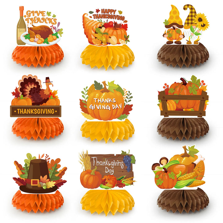 Unique Design: These friendsgiving decorations honeycomb centerpieces perfectly cater to the thanksgiving theme, printed with gnomes, sunflowers, turkeys, pumpkins, hats and other classic thanksgiving patterns, which can make your thanksgiving party full of autumn atmosphere and thanksgiving atmosphere.