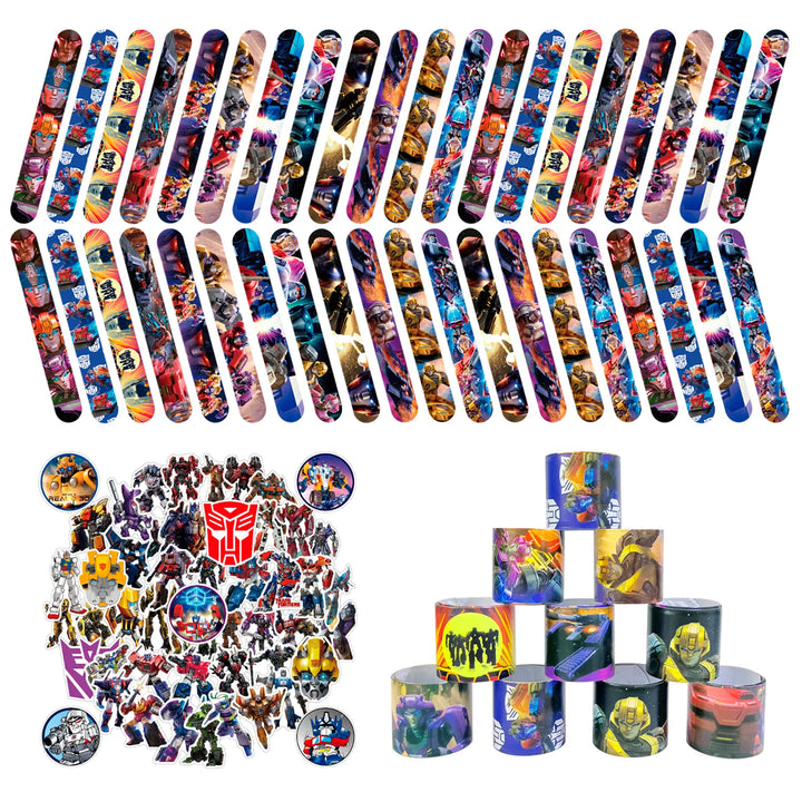 Transformers Party Gift Set: Our Transformers party gifts include 40 different colors and patterns of Transformers bracelets, and 50 different patterns of Transformers stickers, so boys and girls can freely choose their favorite Transformers character.