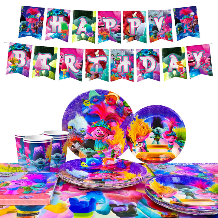 Trolls Theme Party Set: This Trolls theme birthday party decoration supplies set includes 1 Trolls party tablecloth, 16 7'' Trolls party plates, 16 9'' Trolls theme birthday party plates, 16 Trolls napkins and other Trolls party supplies for 16 guests.