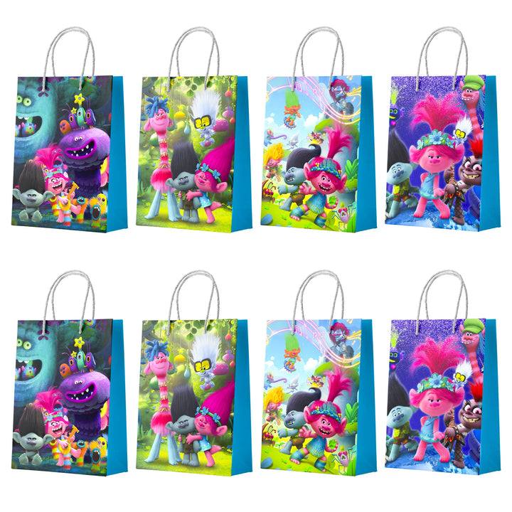 Trolls Gift Bags for Party Favors: You will receive 16 beautifully designed Trolls Birthday Party Bags, including 4 different patterns of Trolls bags, so that these Trolls Birthday Decoration Paper Bags can bring you a better experience.