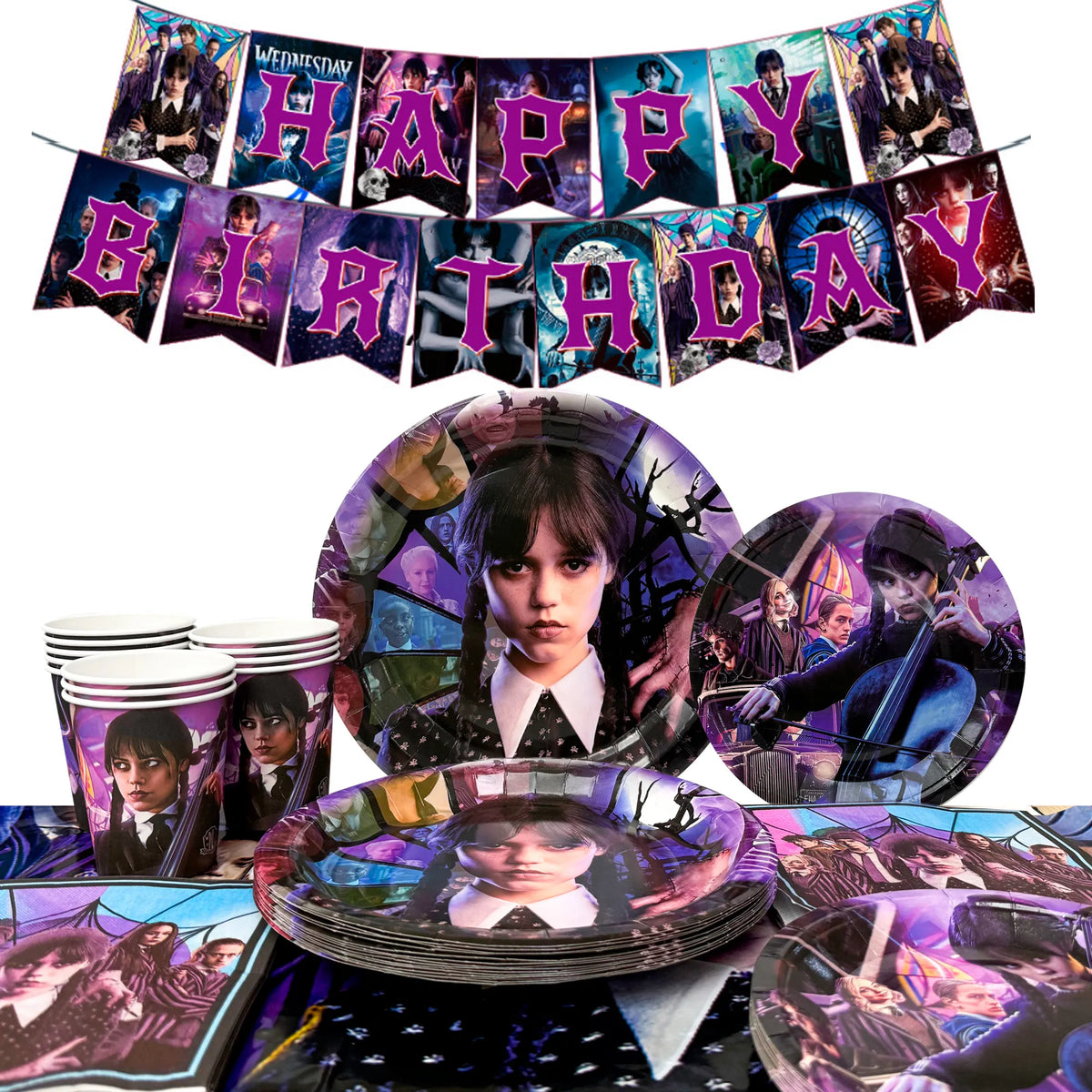 Wednesday Birthday Party Decorative Tableware: Our Wednesday party supplies tableware set includes 1 Wednesday birthday party banner, 1 Wednesday tablecloth, 16 7" Wednesday birthday party plates, 16 9" Wednesday party plates, 16 Wednesday birthday party napkins and 16 Wednesday cups and other Wednesday party decorations.